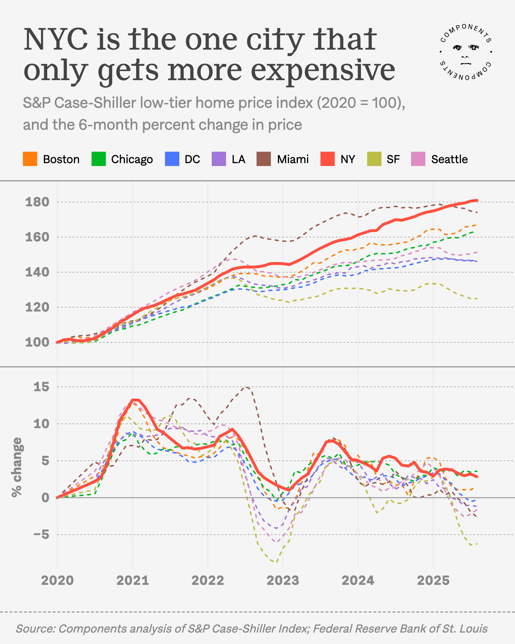 - New York City is the only major city in the U.S. that hasn't seen a decrease in low-tier housing costs since 2020, according to a Components analysis of the S&P Case-Shiller Index.