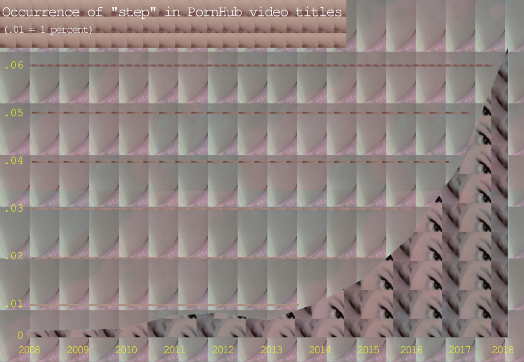 AT: I see these tube sites and the step porn as existing in parallel with streaming services, between Spotify, between Netflix, where there’s this attention-deficient bouncing between pieces of content, this hyper fragmentary form of engagement, which is just postmodernism. Spotify or Netflix are designed to fulfill a very shallow engagement with music or film and television, and you can see certain content rise to the top of both of them because each of these modes has an optimum. In the case of Spotify, I think Drake has largely achieved his unfathomable success because he is the precise sweet spot within Spotify Mode, this endlessly listenable, mostly ignorable, affect-regulating muzak. To me, the exponential emergence of “step” is arguably the sign of a similar phenomenon, like step porn is the Drake of porn.