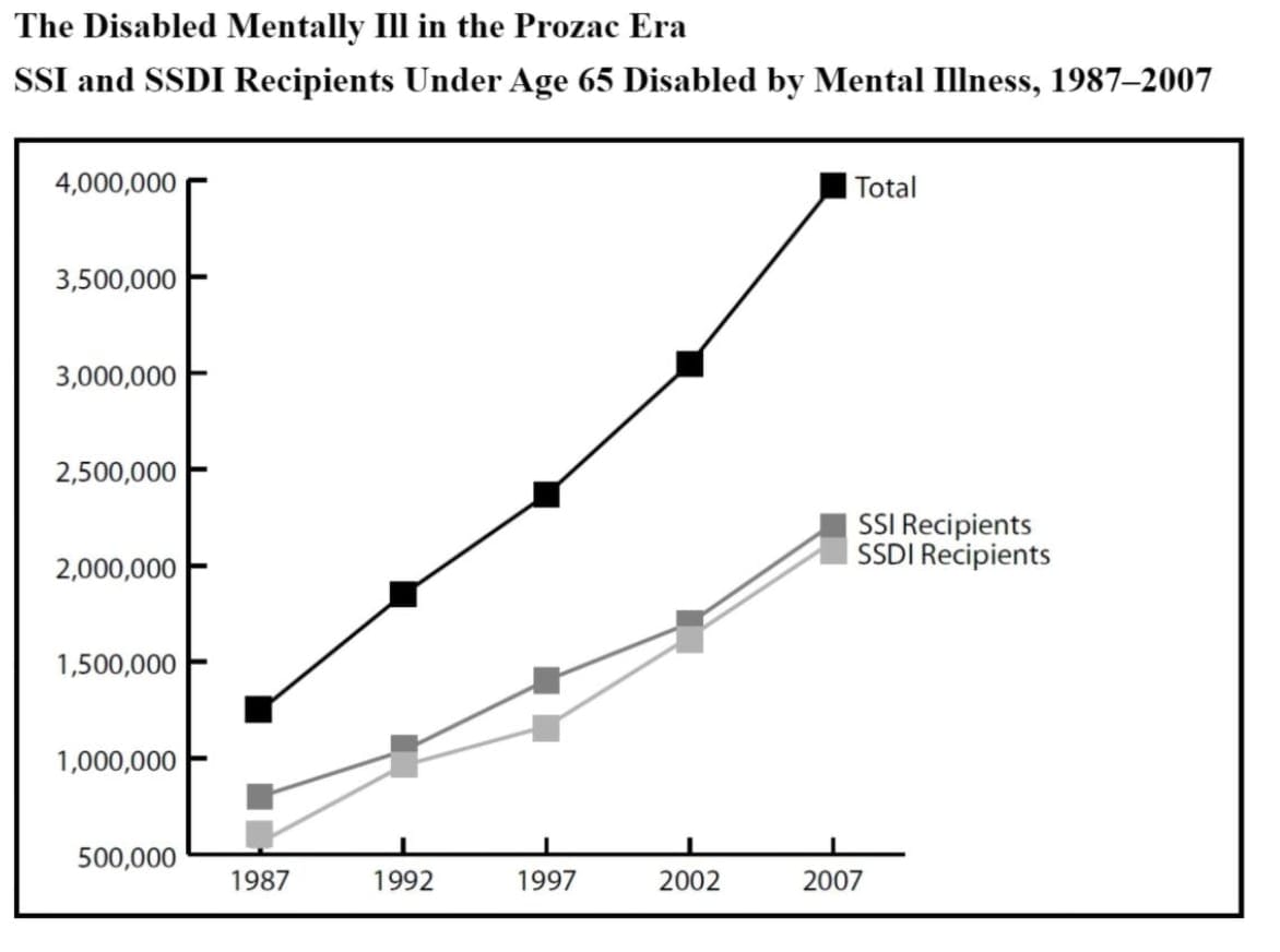41. Anatomy is an attempt to reconcile a paradox: Why, amid the explosion of supposedly life-saving psychopharmacology, have disability rolls for mental illness in the United States skyrocketed, going from 1 in 184 Americans in 1987 to 1 in 76 in 2007? Why did those rolls increase for children thirty-five fold while they declined for every other cause? Amid this renaissance of treatment, why have people seemed to get sicker and sicker?