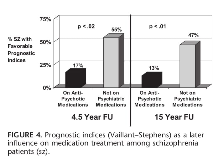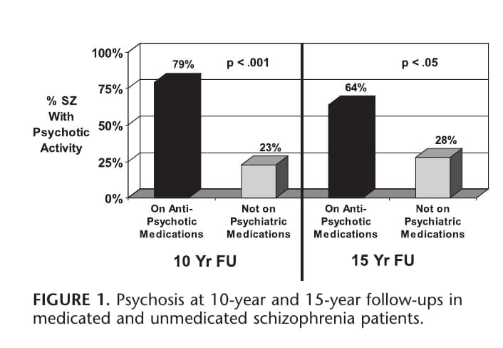 45. On every measure, the unmedicated group performed better than the medicated one. The group that remained off the meds was rehospitalized at a lower rate, had better “global functioning,” more favorable prognosis, and experienced psychosis significantly less frequently.