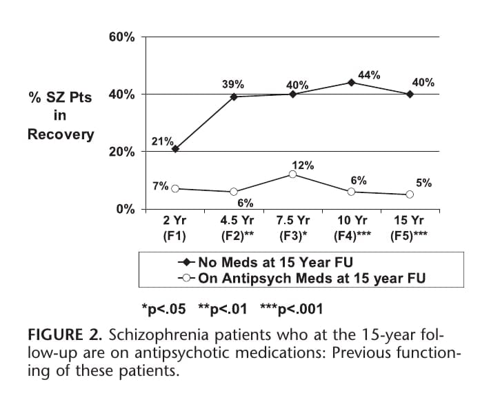 44. In 2007, Martin Harrow, a professor of psychiatry at the University of Illinois Chicago, published a 15-year study on the divergent outcomes of people admitted to hospitals in Chicago for schizophrenia or other forms of psychosis. In the fifteen-year period, Harrow’s team checked in with the patients five times and assessed their long-term outcomes on a number of metrics, including their relapse into psychosis or other symptoms, their ability to support themself, exist among their community and family, work, avoid hospitalization, and so on.