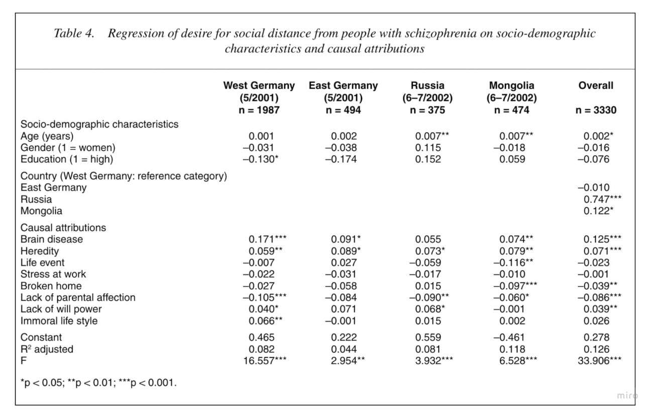 39. Following up on these results in 2003, researchers from the University of Leipzig surveyed respondents in four regions – East Germany, West Germany, Russia, and Mongolia – to measure how respondents perceive people suffering from schizophrenia or depression based on the etiology of the condition. When people associated the conditions with biological causes, they also expressed more desire for social distance from the afflicted individuals. "Attributing the causes to socialization results in a reduction of the social distance desired," they wrote. Turkish researchers discovered the same aversion to people whose distress is medicalized the following year.