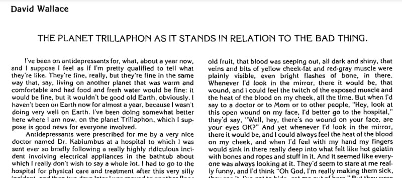 72. One of Wallace’s first stories, published while a student at Amherst, was titled “The Planet Trillaphon as It Stands in Relation to The Bad Thing.” The Bad Thing is the semi-autobiographical college student narrator’s word for what the doctor diagnoses as “severe clinical depression.” The narrator describes the sensations of The Bad Thing, the aching sickness he feels, and so on. To the narrator, this Bad Thing has no origin. It just is. And as the narrator comes to realize, the fact that the Bad Thing simply is parallels the way that he himself simply is. “[Y]ou say to yourself, ‘Boy oh boy, how the heck is the Bad Thing able to do this?’ You think about it — really hard, since it’s in your best interests to do so — and then all of a sudden it sort of dawns on you . . . that the Bad Thing is able to do this to you because you’re the Bad Thing yourself! The Bad Thing is you. Nothing else: no bacteriological infection or having gotten conked on the head with a board or a mallet when you were a little kid, or any other excuse; you are the sickness yourself. It is what ‘defines’ you, especially after a little while has gone by…[Your] very essence is characterized by nothing other than the feature of sickness; you and the sickness are, as they say, ‘one.’”