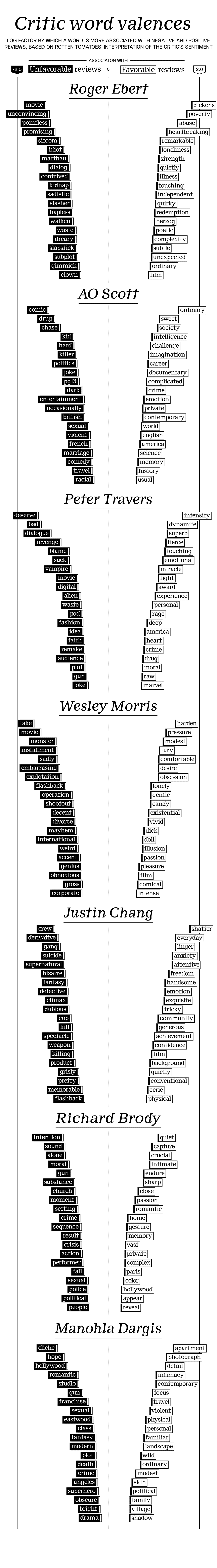 Thompson: What’s so interesting about A.O. Scott’s work, the words that are more correlated with positive reviews are things like “sweet,” “society,” “documentary,” “intelligence.” And the things he likes least are exactly what you mentioned: “comic,” “drug,” “chases,” “politics,” “dark,” “killer.” Whereas with Brody, the valances that come out are a bit more opaque.