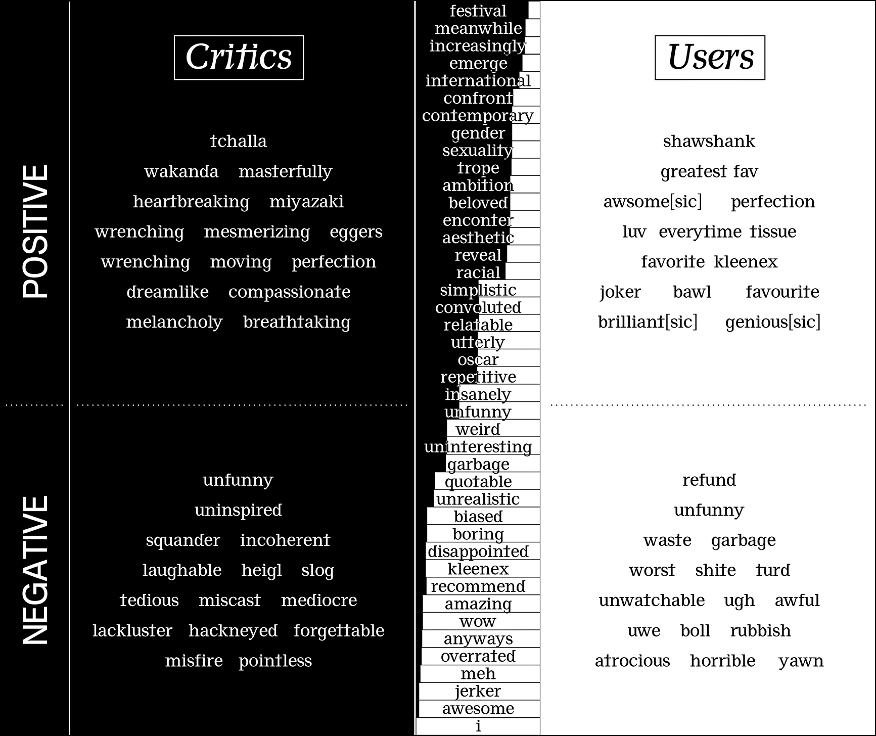 Thompson: To zoom out and consider Rotten Tomatoes in the aggregate, when you do this analysis of the whole universe of their critic reviews the term that was most associated with the red tomato was “T’Challa,” from Black Panther. Number two is “Wakanda.” As you go down there’s terms like “heartbreaking,” “restoration,” “mesmerizing.” And then on the negative side, one of the greatest sins you can commit is to be “unfunny” or “uninspired.” Then it’s, you know, “mediocre” and “slog” and such. When you just look at users, it’s similar. “Unfunny” is at the bottom.
