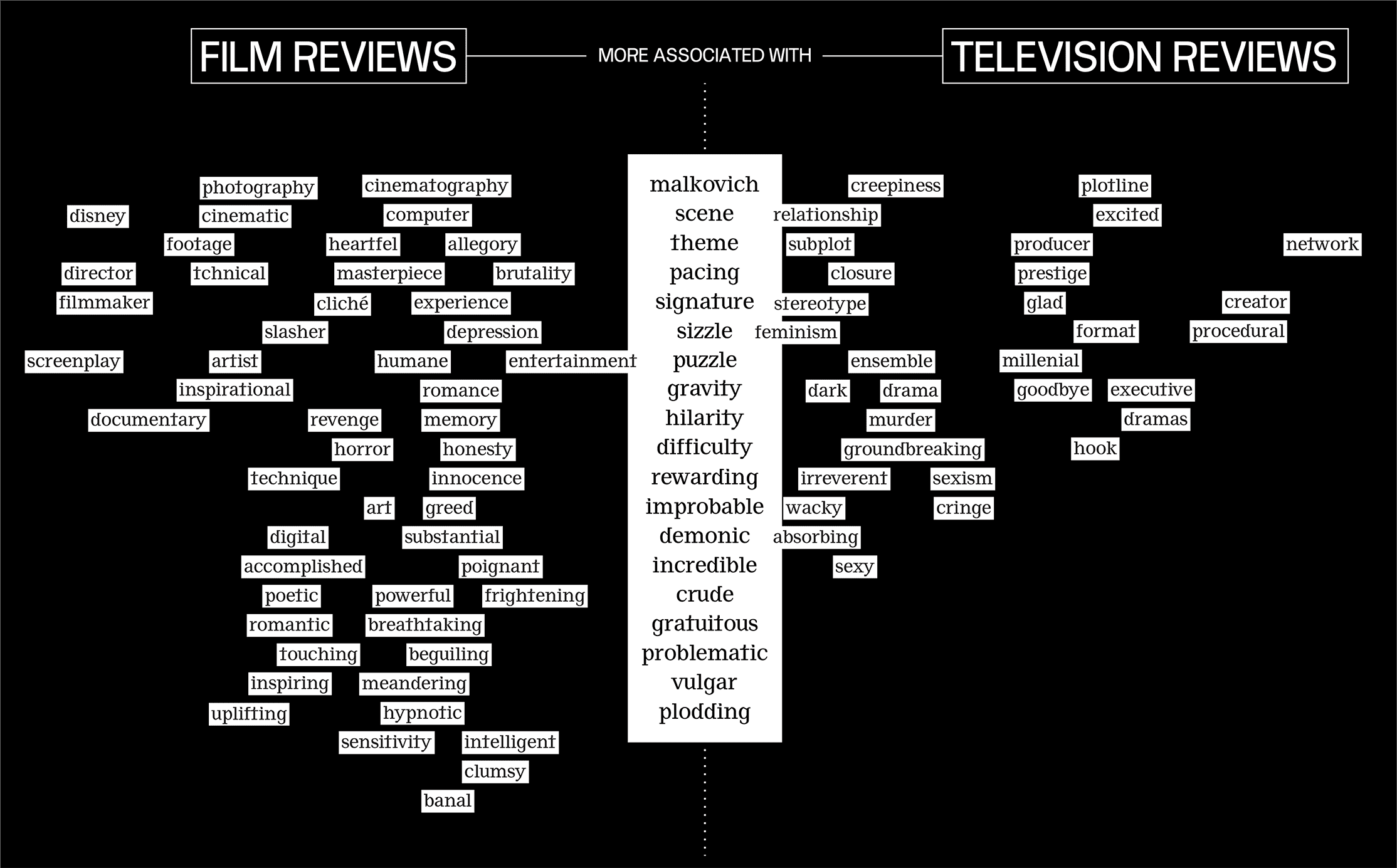 Thompson: Rotten Tomatoes has reviews for TV as well as film, and when we looked at the words most prevalent in those television reviews it’s basically all people’s names and show titles. “Costner” and “Broadchurch.” So there isn’t really a language around television the way there is around film. It’s all about the characters within the show or the people involved in the process of making it.