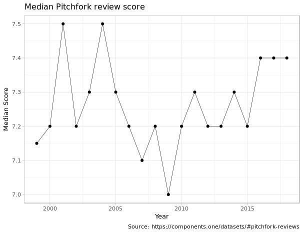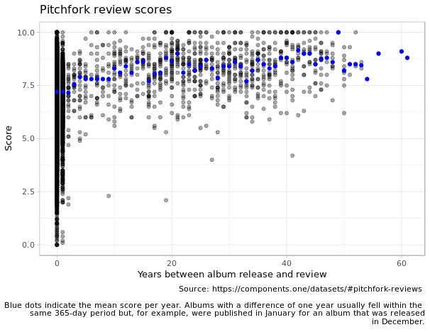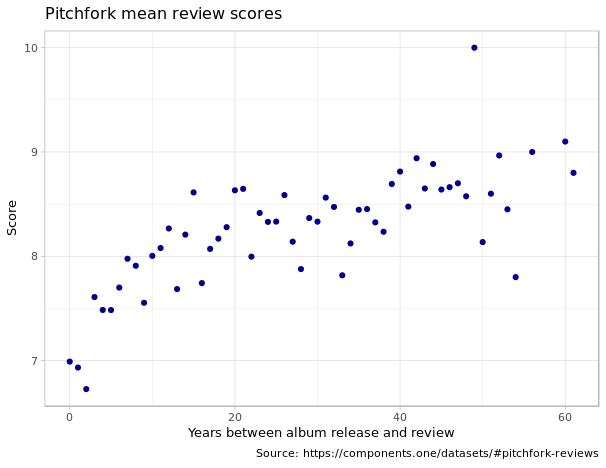 AT: It’s hard to say by just looking at the reviews themselves without pulling in outside data, like tour revenues and album sales or streaming figures and that kind of thing. But what I’d found looking at this data earlier was that the things that Pitchfork gives 10s to tend to be these nostalgic look-backs.