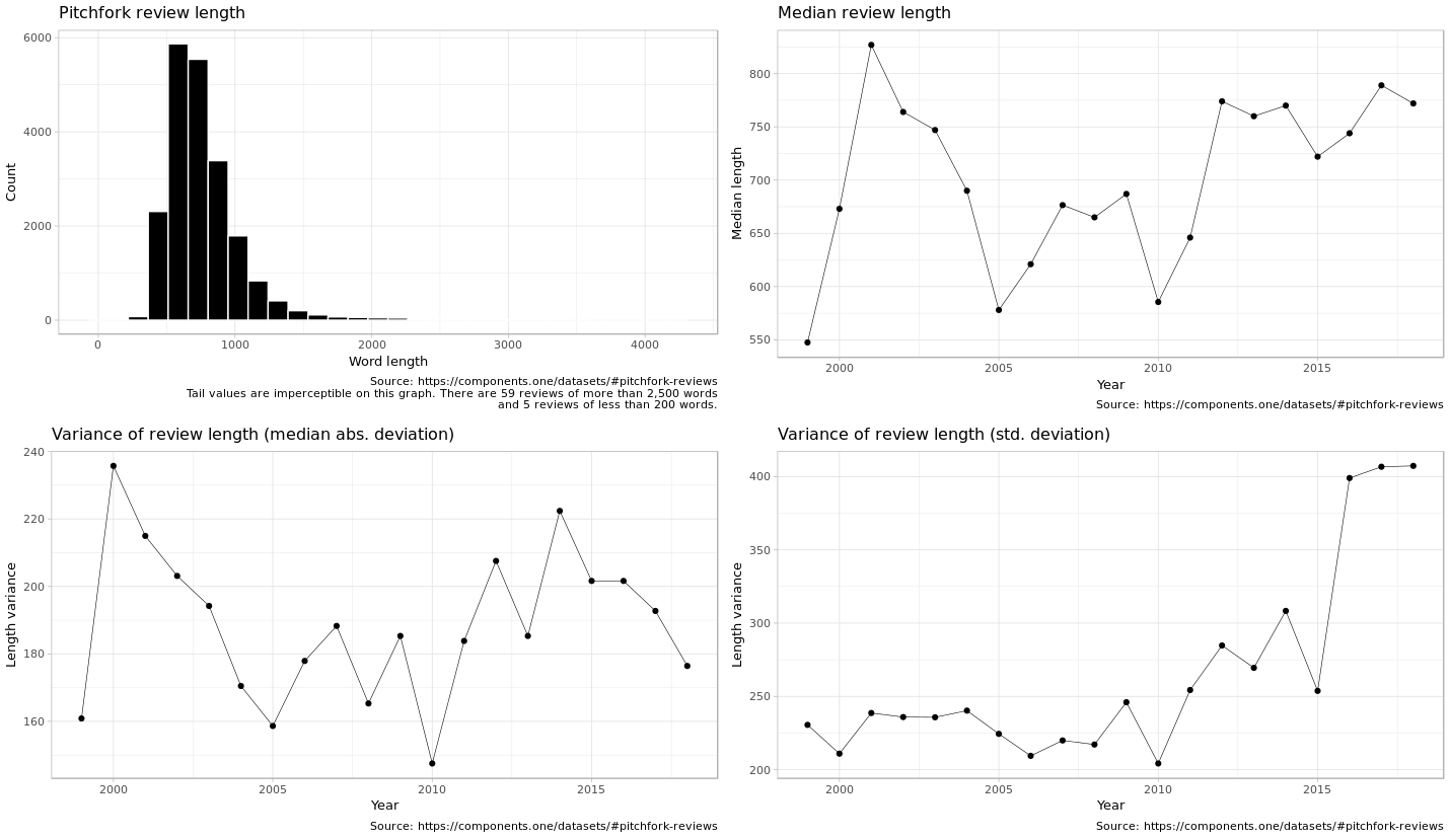 AT: Well the variance of length has gone up [fig. 4, bottom right]. The length over the years is kind of across the board [fig 4, top right], there’s no real pattern to it. And this is the distribution of review length just across all reviews [fig. 4, top left]. And this doesn’t tell you much, the fact that the median review is around like 700 words. But this is the variance of length. So there’s much larger variance than there used to be.