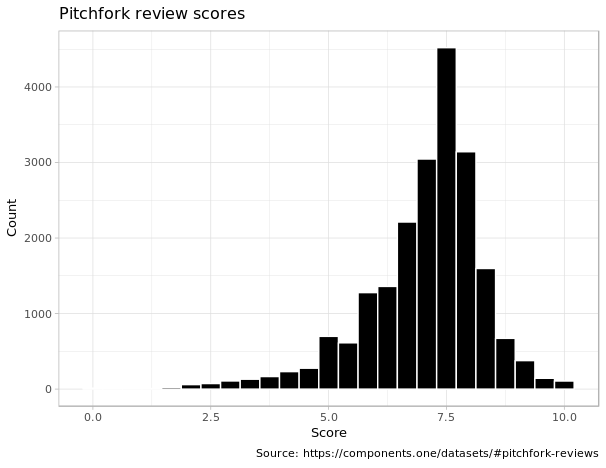 So this is a histogram of how their scores are distributed. The average Pitchfork score is almost exactly 7, the median is 7.3. From your perspective, what is the Pitchfork rating system? What is its intent and its effect?