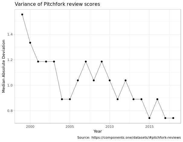 NS: I think what that shows is just that literally it has become less independent. When you had a larger deviation of scores, you had pretty distinct perspectives that were making extremely diverse assertions about music. You were going to have people veering all the way to the left and then veering all the way to the right, as opposed to more middle-of-the-road reviews, which I think is a kind of normalization, which mirrors every economic trend we’ve seen over the past 20 years— including the American political discourse.