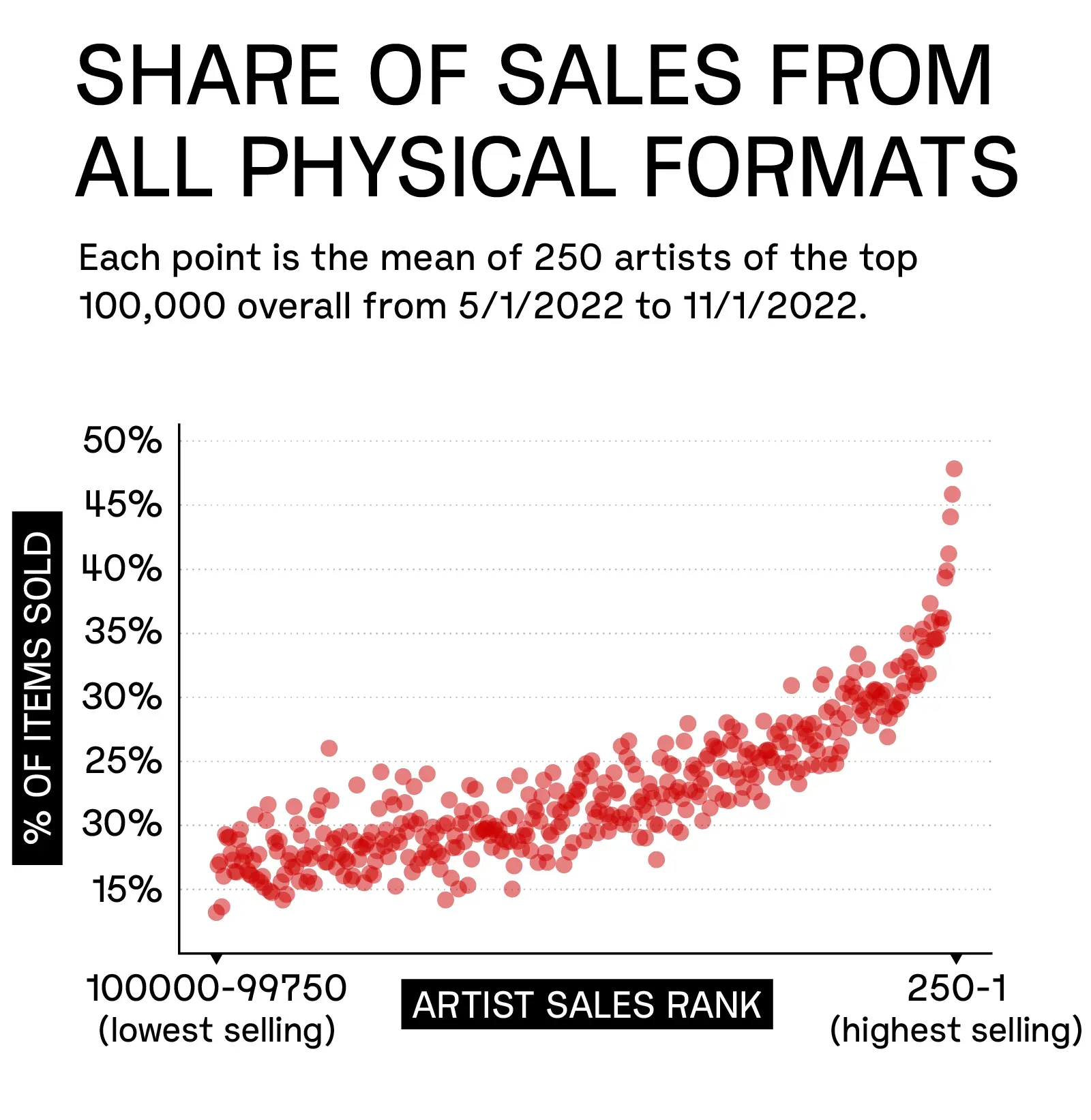 The inference from all this — Gunn's placement among top artists and the disproportionate amount of revenue generated from physical sales sitewide — becomes explicit when looking across all artists on the platform. On balance, the more money an artist makes from selling physical stuff, the more money they make overall, which we've measured by their sales rank.