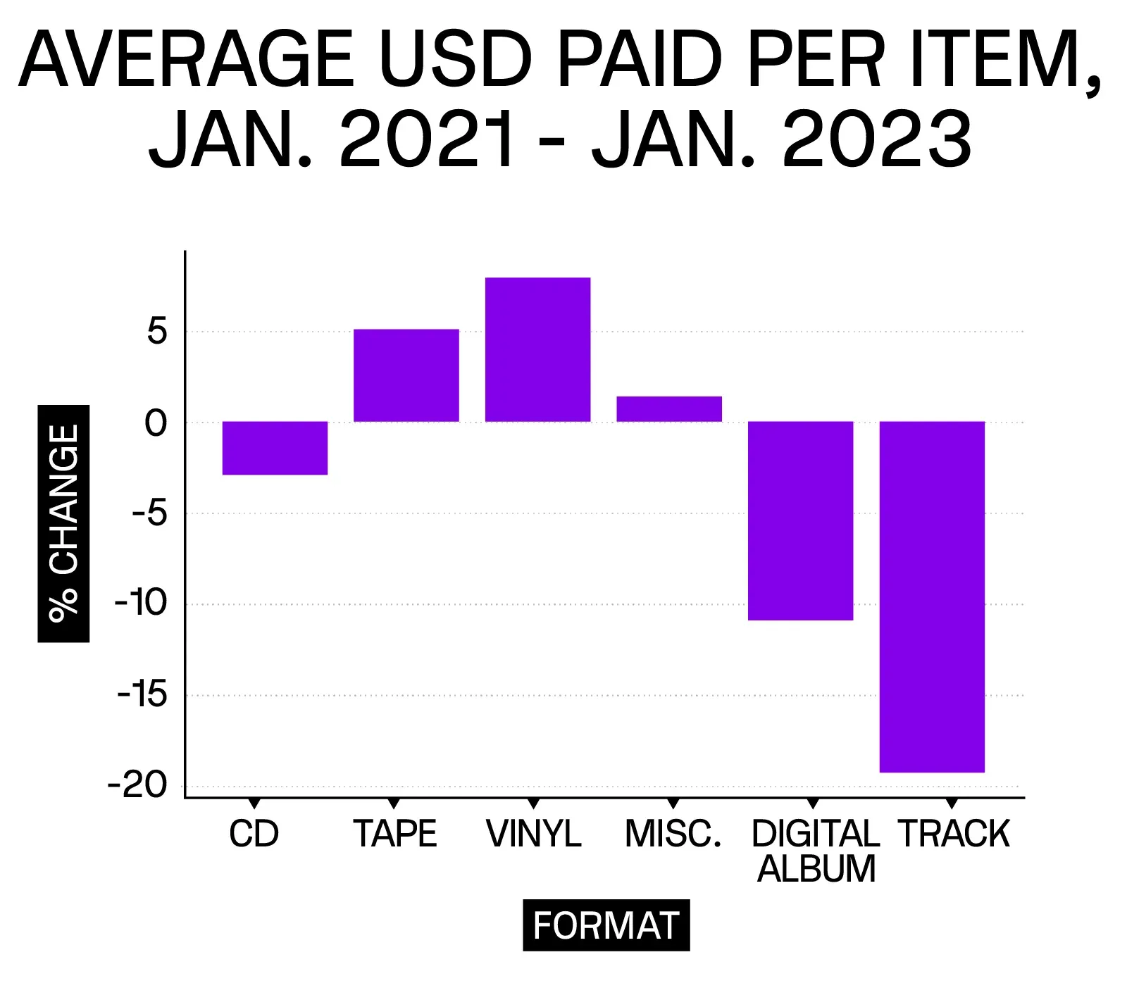 First, and perhaps most obviously to anyone trying to press an LP, producing vinyl has become more expensive. That trend appears in the average price paid for the format on Bandcamp over the past couple of years. (The change is not due to increasing generosity of buyers electing to pay more over the minimum for vinyl, a rate that has remained almost completely stable for physical goods across this time.)