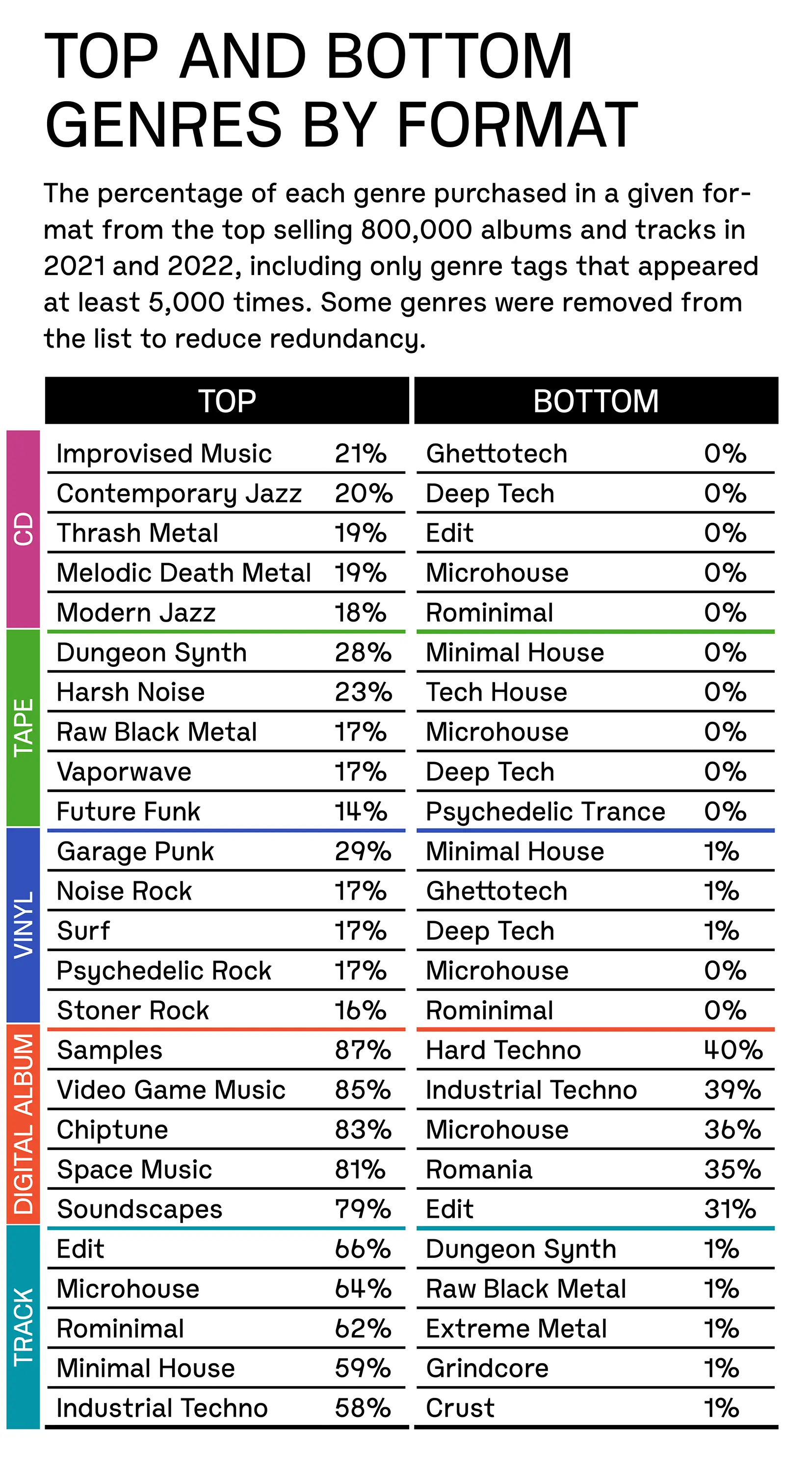 Within the entirety of Bandcamp's marketplace, this makes Daupe an anomaly. Artists on Bandcamp almost universally sell digital albums and tracks, with the additional option to purchase physical merch like vinyl, cassette tapes, CDs, and other miscellaneous items like booklets and clothes. From the perspective of Bandcamp's origin — emerging after Radiohead's pay-what-you-want experiment with downloads for In Rainbows — this makes sense. But even in our original report on the company, we found that physical items played an outsized role in the site's revenues: The original figures from late 2020 show that physical items, despite comprising less than a quarter of the actual goods sold on the site, make up about half the revenue it generates.