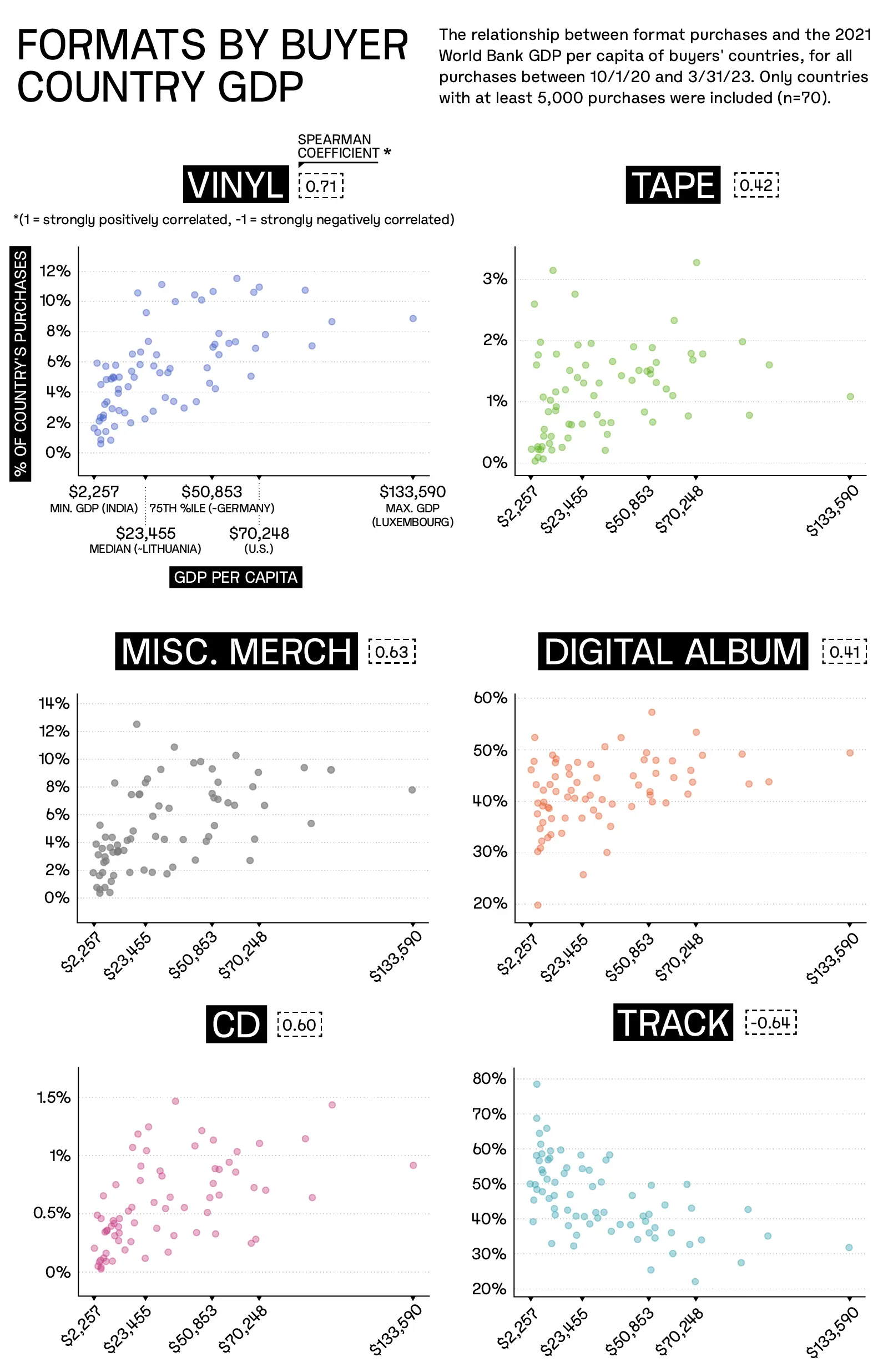 We further analyze the limitations of overreliance on vinyl as a vessel of this experience, including the affinities between different kinds of music and different formats, and the changing demographics of Bandcamp customers, who increasingly come from countries with lower GDPs and are far less likely to buy vinyl than customers from richer countries.