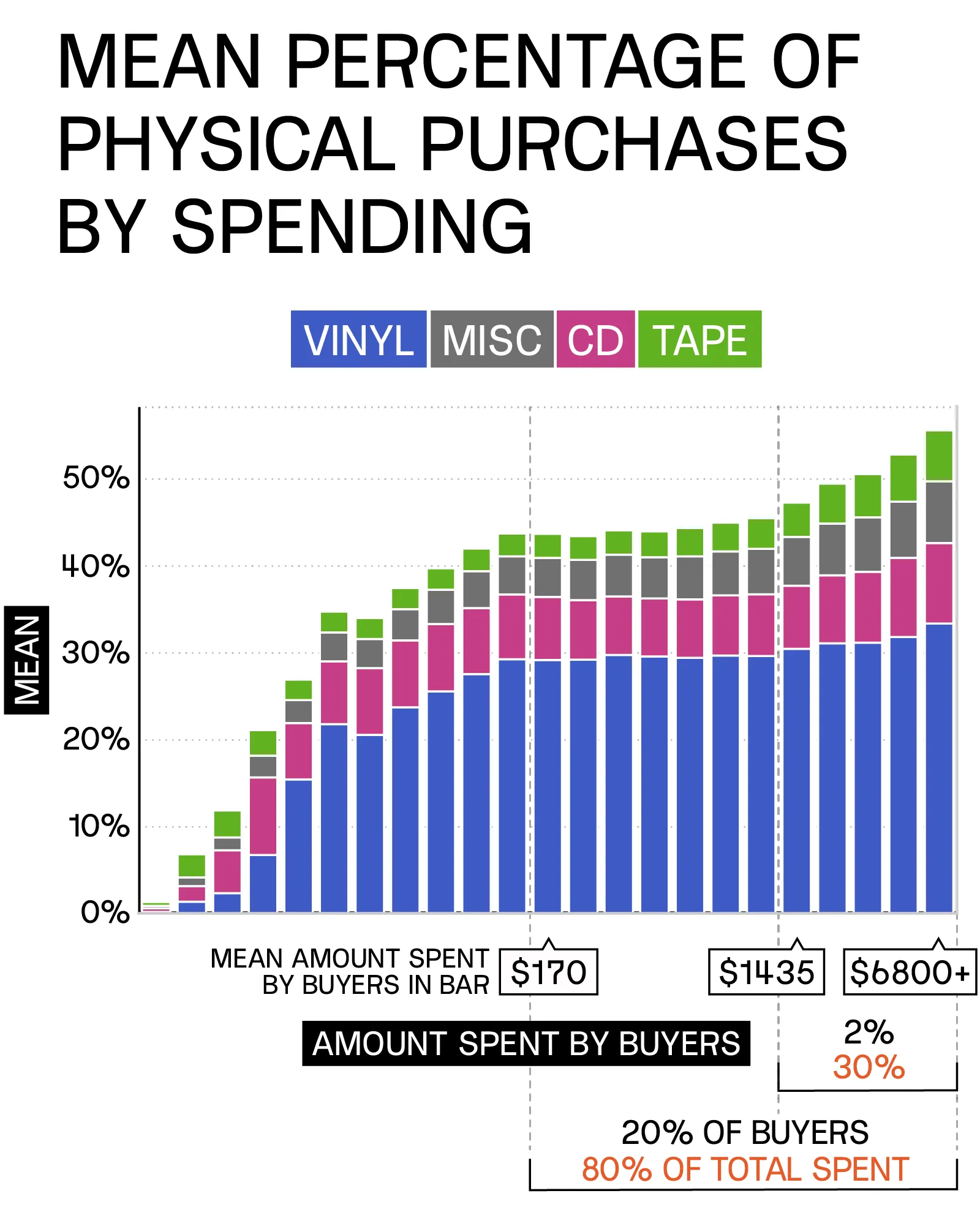 As people spend more money, the share of physical purchases they make keeps climbing. On average, purchases of physical objects by those in the top 20% of buyers generate about 47% of dollars spent in our data, but again, this is certainly an undercount, and the proportions are likely higher.[^3] Among that quintile of buyers, vinyl alone comprises about 30% of all money spent, more than tapes, CDs, and other merch combined.Non-musical merch like t-shirts are not included in people's public collections, so this miscellaneous category is underrepresented, which both pulls down the spending on physical purchases overall, and specifically those things in the miscellaneous category. Additionally, any objects that aren't part of a public collection is not included in the model. However, we assume that this discrepancy isn't so great that it would displace vinyl as the primary object, which is ultimately what we're driving at.
