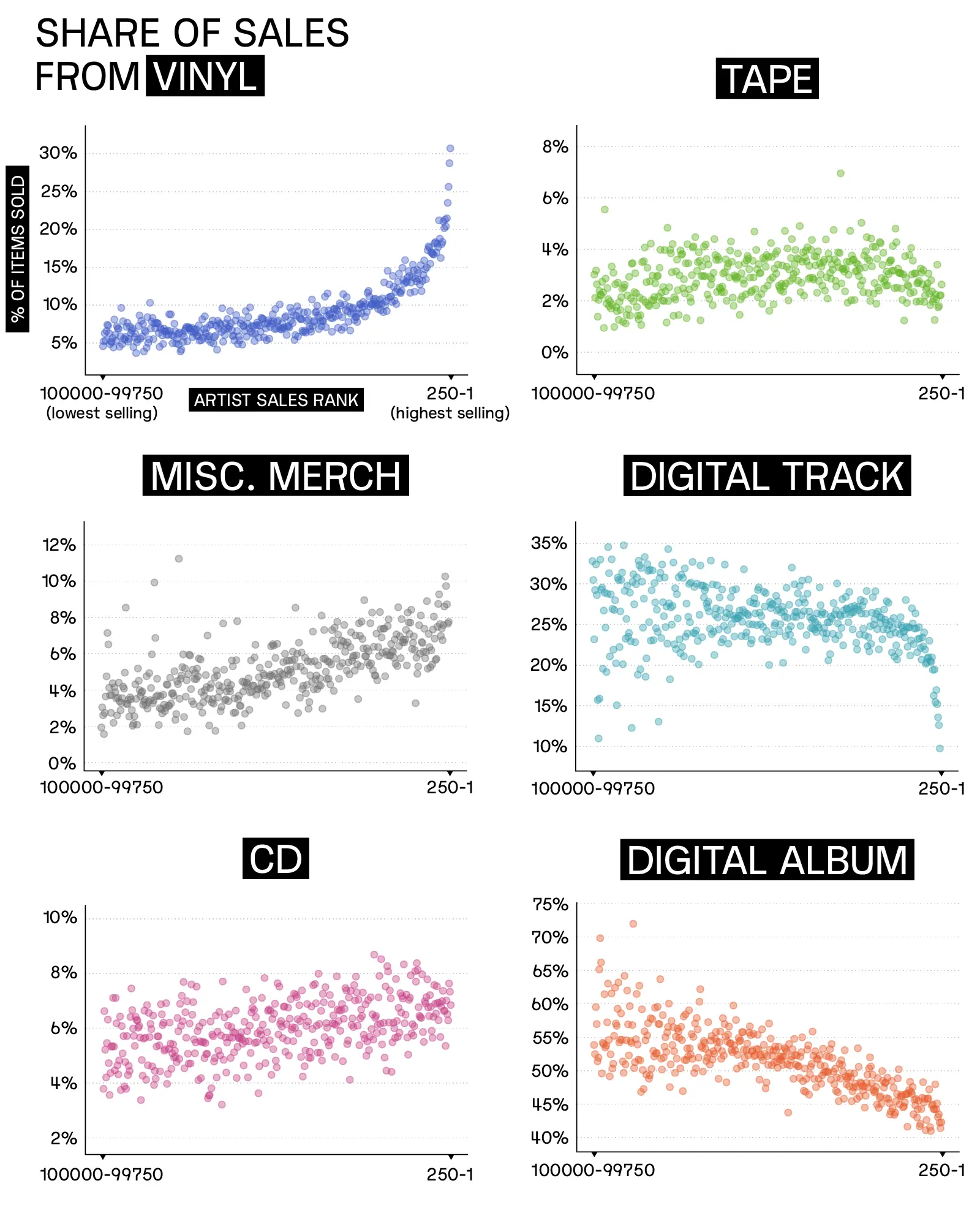 This relationship is not equal among all objects. While there are positive relationships between artists' sales rankings and CDs and merch, and a mostly positive relationship with ranking and tapes (one that drops off among the highest selling artists), the linkage between sales ranking and vinyl sales is the most stark. In other words, in the simplest and most reductive terms, the artists on Bandcamp who are able to move the most vinyl are the ones likely to make the most money, while those whose sales depend most on digital music end up making the least.