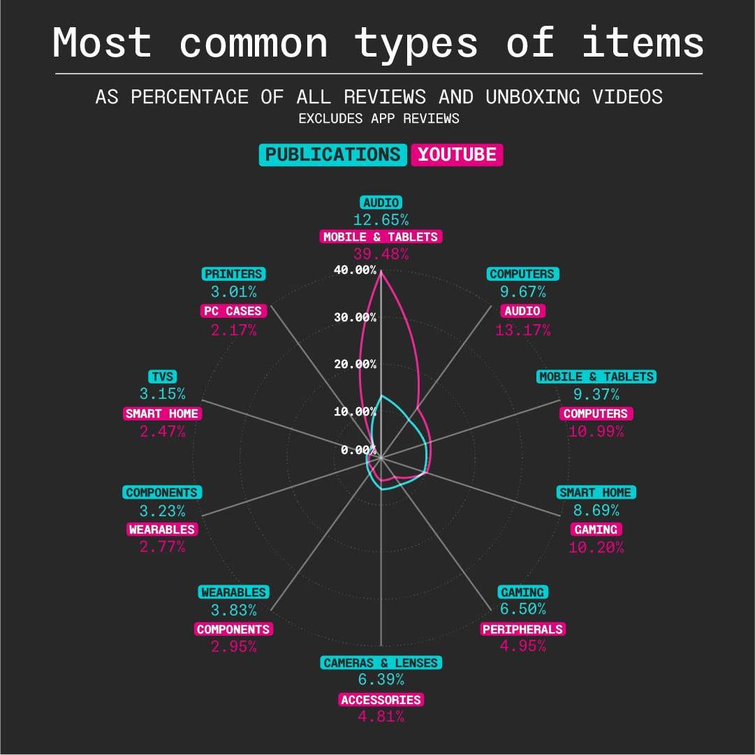 YouTubers have, relative to publishers, winnowed down what they review and unbox to a single product category. While smartphones and tablets [^7] comprise a little under 10 percent of traditional tech reviews, they make up nearly 40 percent of tech YouTubers' review and unboxing content.[^8] And publications are hemmed into a single review per product in a way that YouTubers aren't, where one phone review can be succeeded by endless follow-ups, pitting the "OnePlus 8 vs. iPhone 11," or a video three months later assessing if the OnePlus 8 is still "worth it," and on and on.Product categories for videos were labeled with k-nearest neighbors based on labels from publication reviews. The algorithm was trained on the video's title, top portion of its text, description, and metadata tags. This analysis looked at 17 YouTube channels: Dave2D, Marques Brownlee, The Tech Chap, Snazzy Labs, Unbox Therapy, Mrwhosetheboss, randomfrankp, Jonathon Morrison, Floosy Carter, Hardware Canucks, iJustine, TrackinTech, Geekyranjit, iGyann, Mary Bautista, UrAvgConsumer, and Linus Tech Tips. Only videos that were marked as a review or unboxing video, either in the title, description, or video tags, were included.
