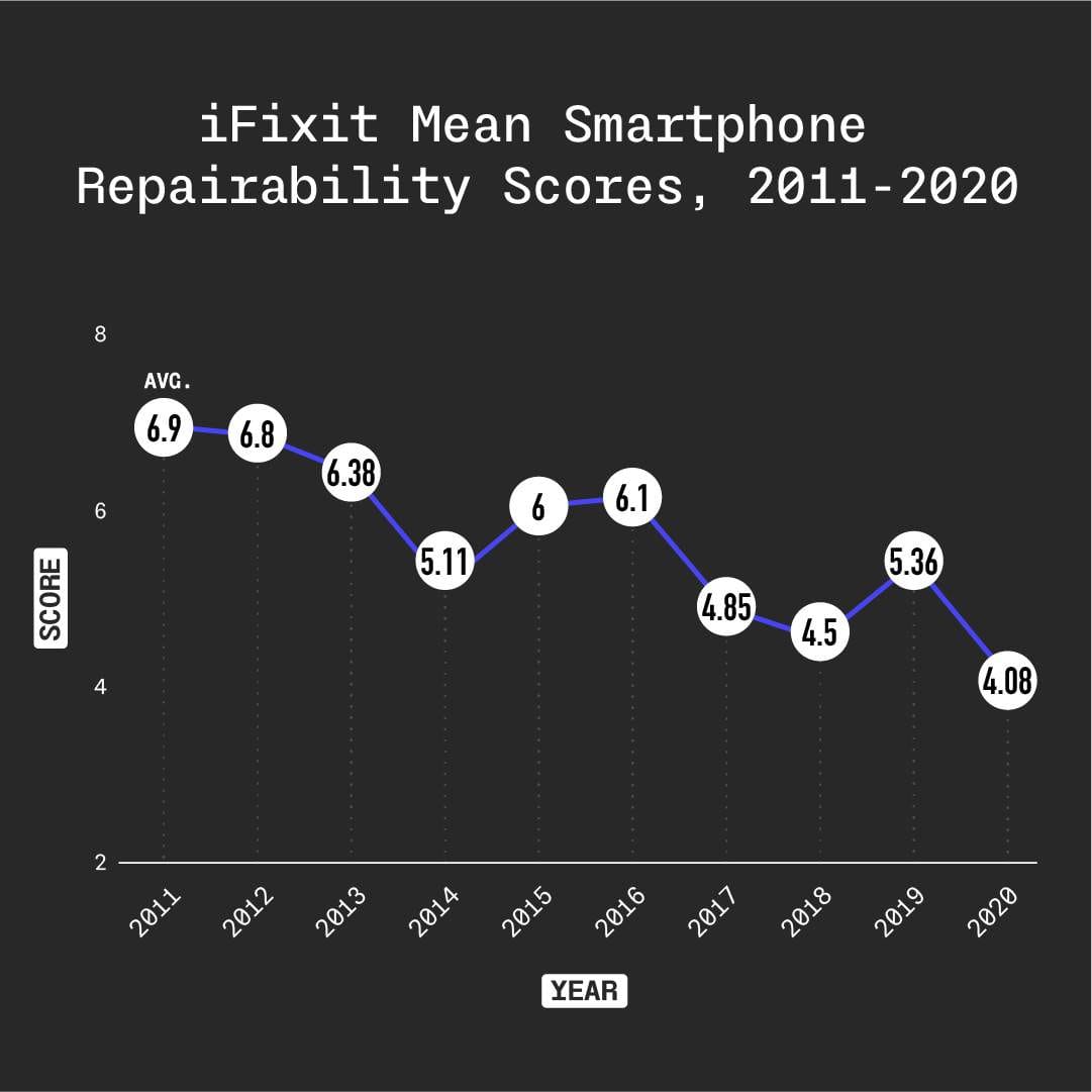 There is one final, important counterpoint to the narrative of technological ascension and possibility expansion. This is the mean repairability of smartphones as scored by iFixit, the repair company based in San Luis Obispo, California. iFixit is a small outfit, and so there's a relatively small number of devices for each year, ranging from half a dozen to 20. It's not a lot of data, but it doesn't matter — the diminishing repairability of consumer goods is now canonical among researchers. Products are less fixable both intentionally, via completely avoidable construction choices like glued batteries and proprietary screws, and because the tech review aesthetic demands a maximization of sleekness and thinness. All of this adds up to fetishized sheen, never mind the cost to the product’s longevity.