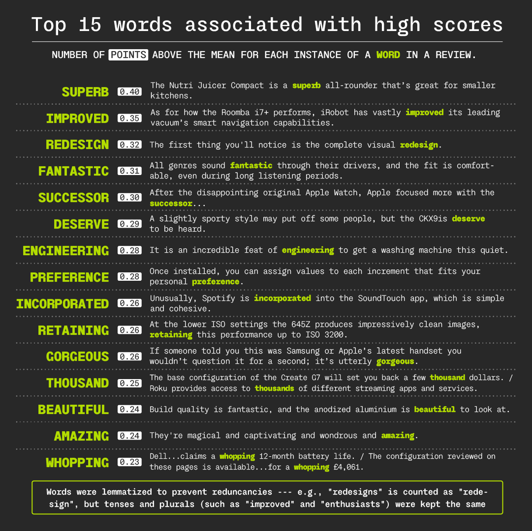 But what are the actual values enshrined in these scores? The relativistic parameters appear explicitly when looking at the 15 words most associated with high scores in reviews. While some words are generically positive across all critical domains ("superb", "fantastic", "amazing"), others bear particular significance within the context of consumer technology. Three concepts emerge: