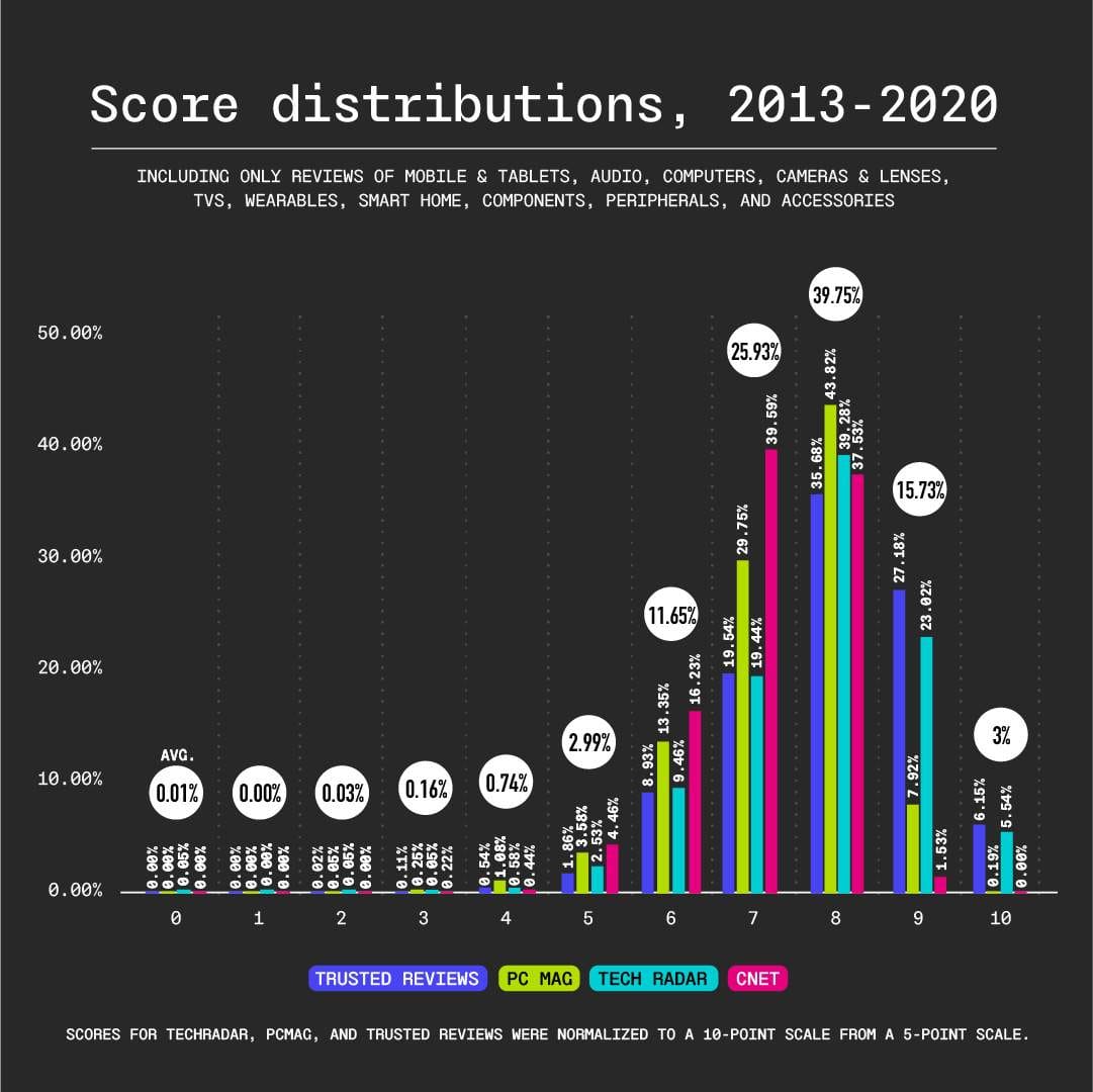 First, no product from CNET, PCMag or Trusted Reviews received a score of 0, and at TechRadar, the number of 0-scoring reviews was so low as to be statistical noise.