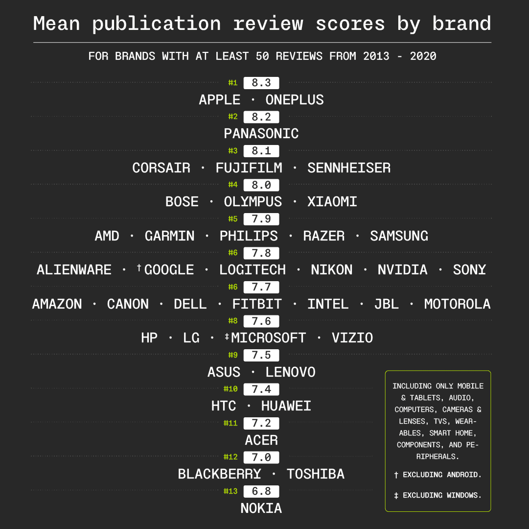 - Through their scores, reviewers refract a paradigm of desire pioneered by Apple to both manufacturers and consumers, encouraging both to pursue the same design values. The company that has most tightly hewed to this code, OnePlus, has been rewarded with critical assessment on par with Apple itself.