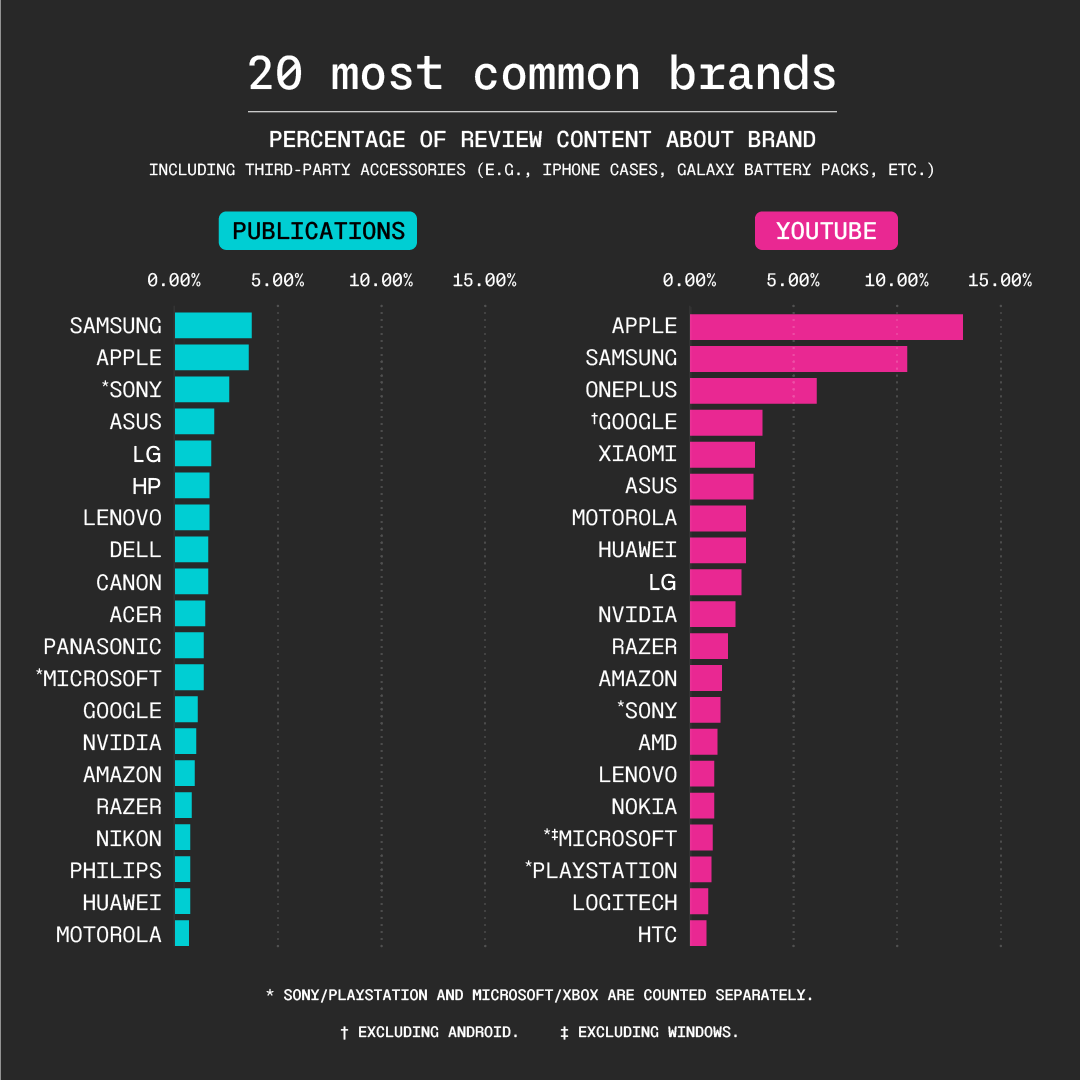The centrality of Apple to tech publishers somehow pales to its role within the YouTube tech ecosystem. 13.2 percent of such videos are about Apple, compared to 3.6 percent of publisher reviews. OnePlus, despite having released only a handful of products in its entire history, is YouTube's third most covered brand at 6.1 percent, compared with less than one percent of publisher reviews, among whom it does not even rank in the top 50.